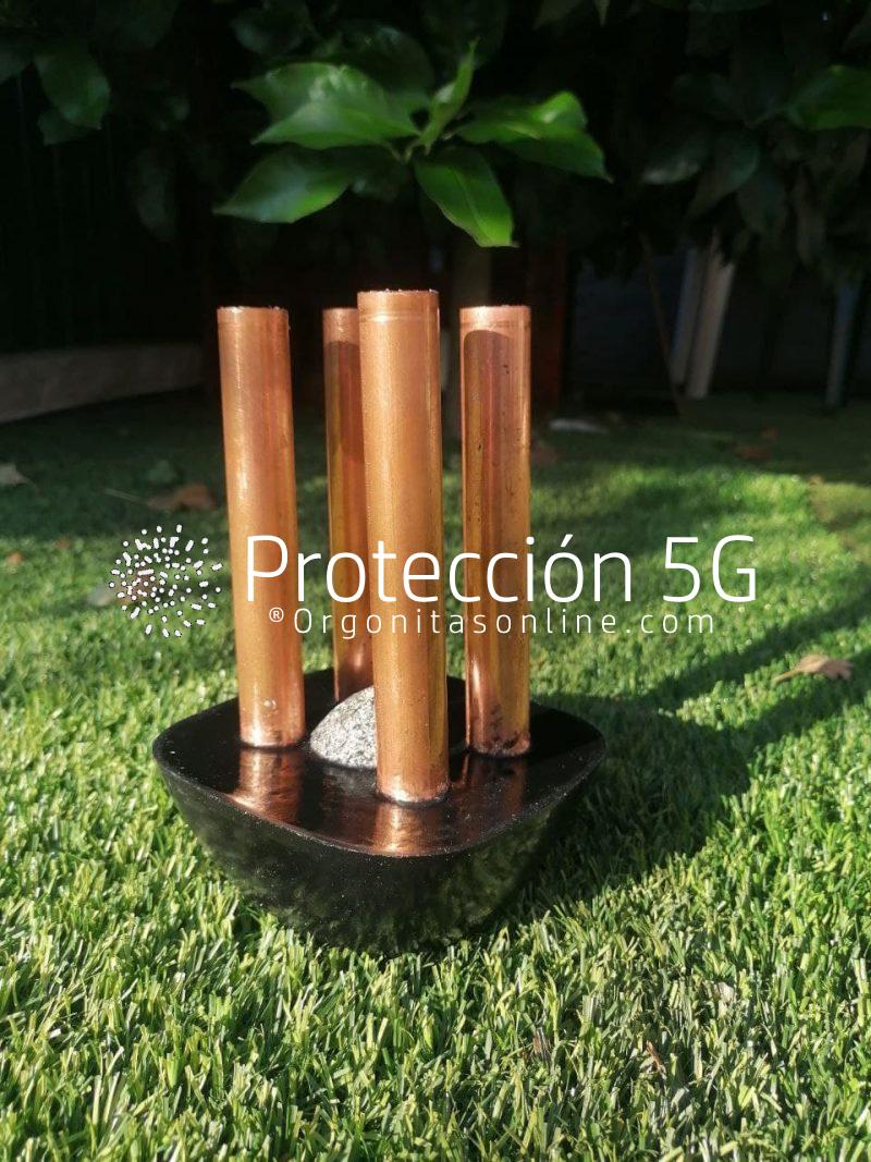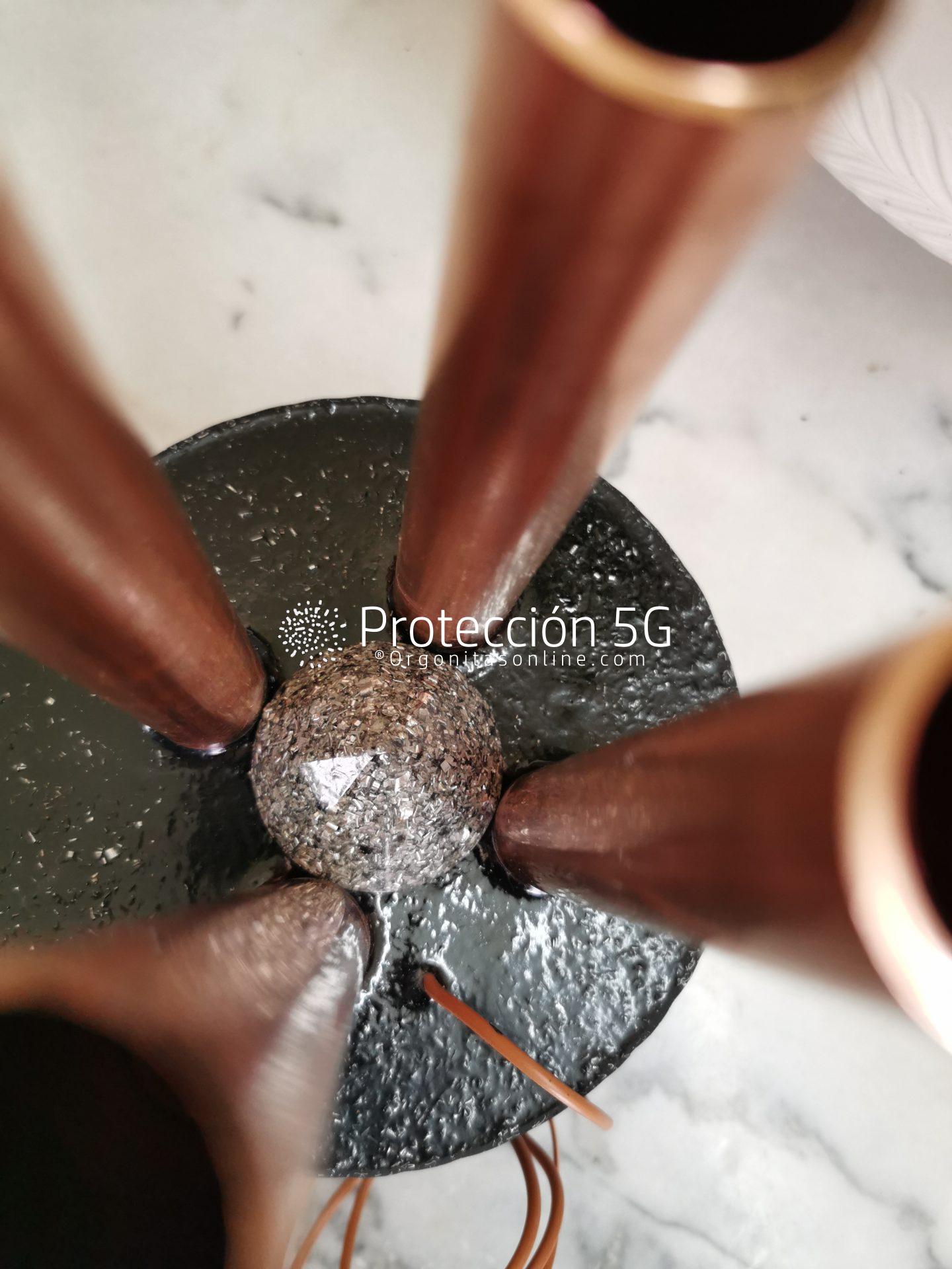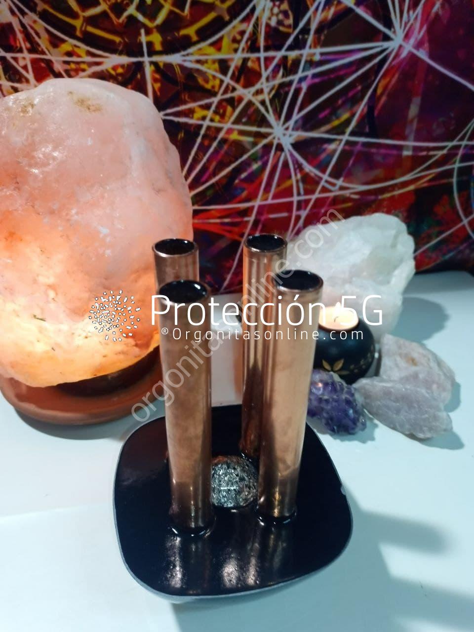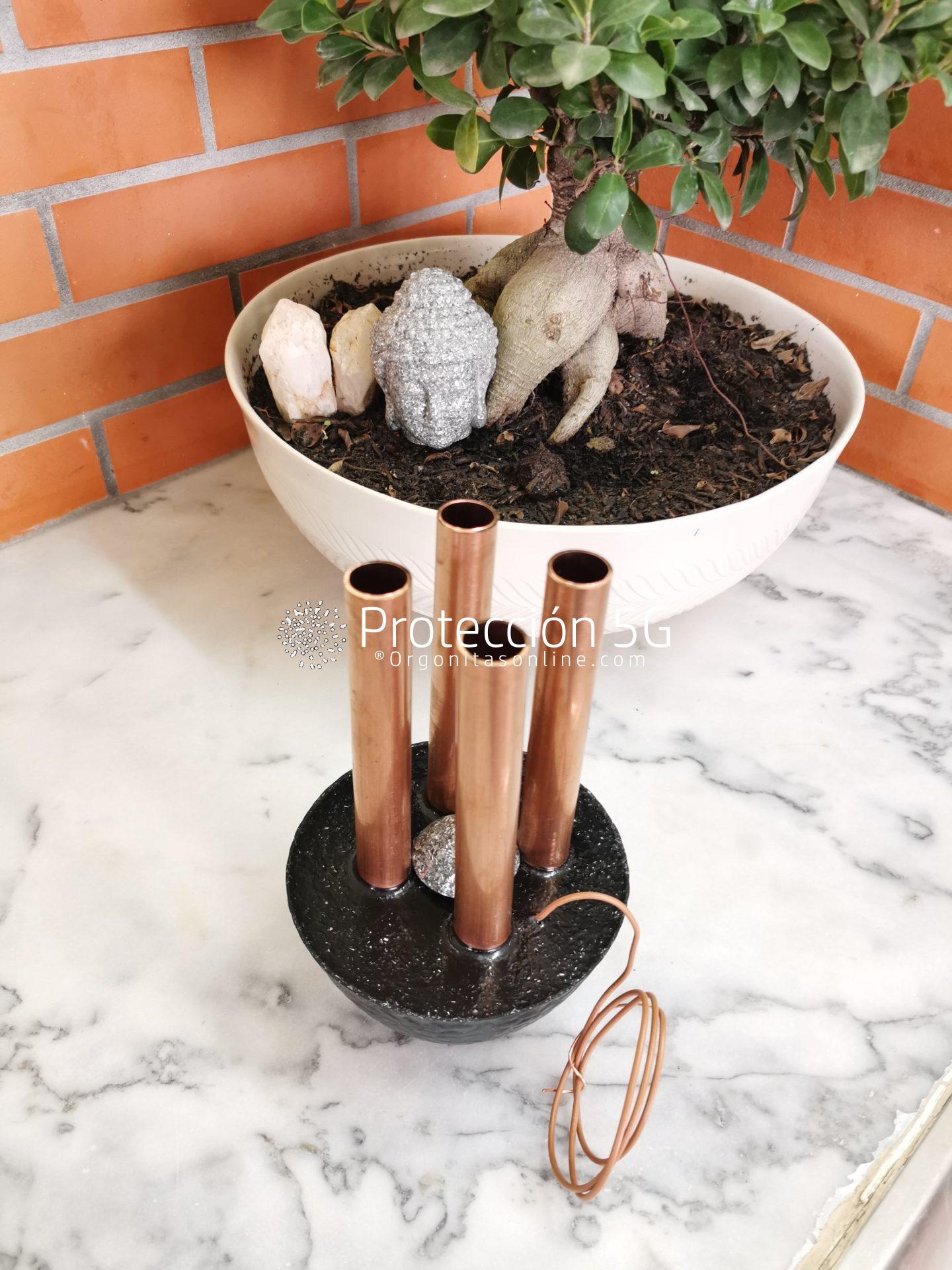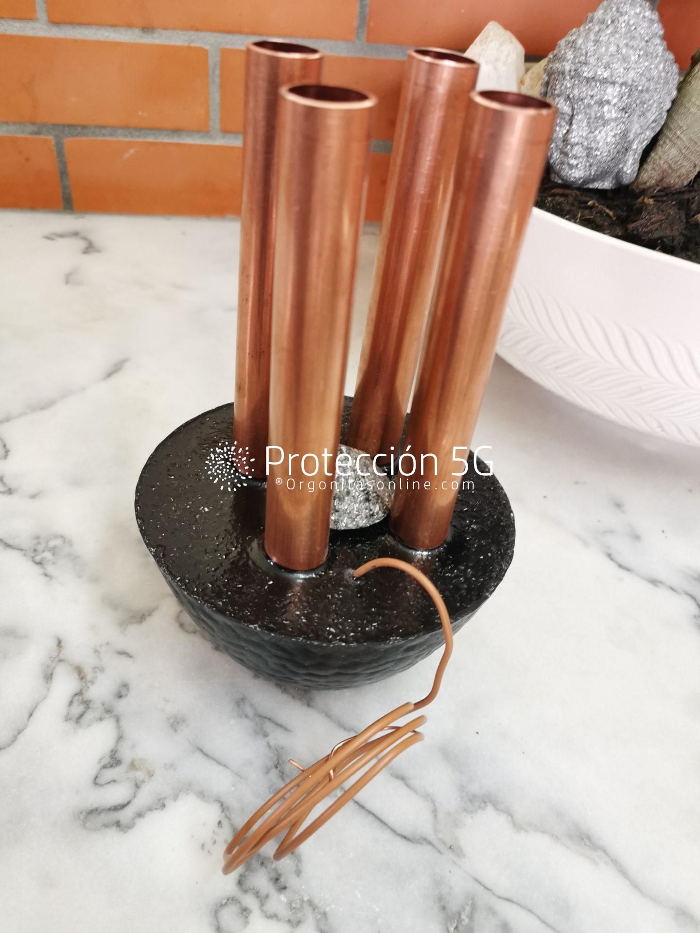 - Con 4 tubos de cobre de 20 cm y 22 mm. de diámetro y en el centro de los tubos, para potenciarlo, lleva una orgonita pirámide diamante.