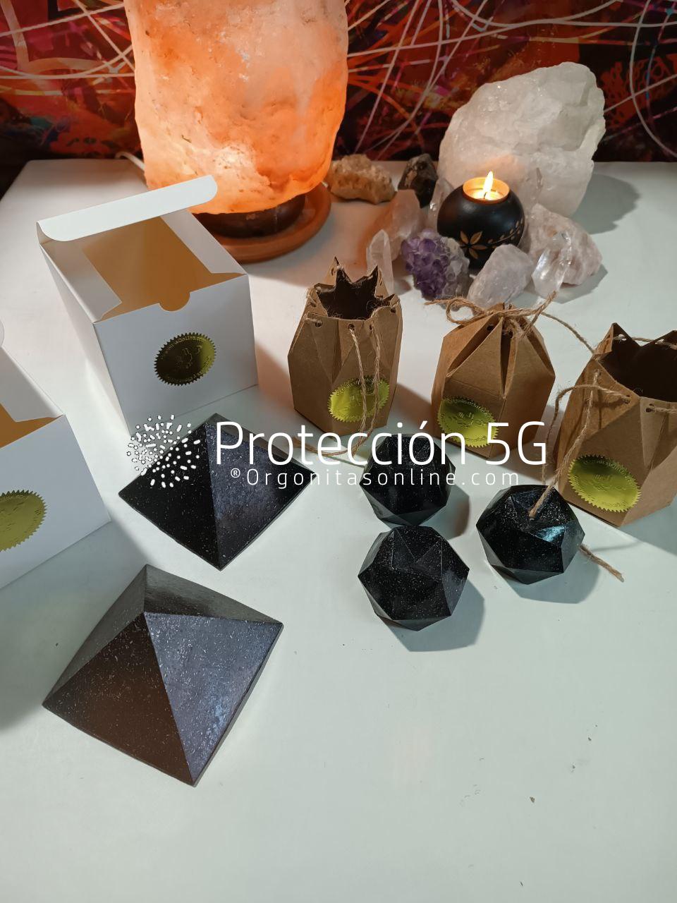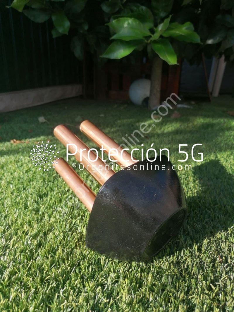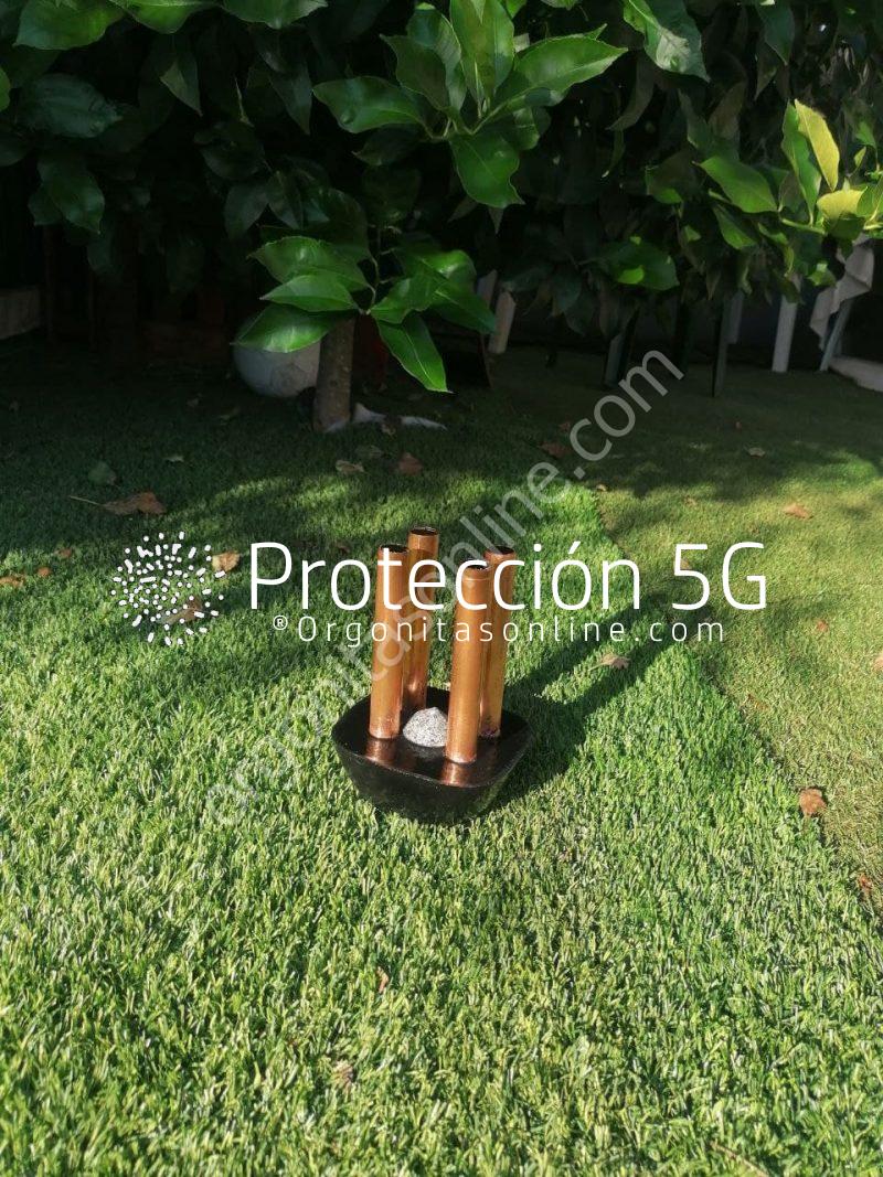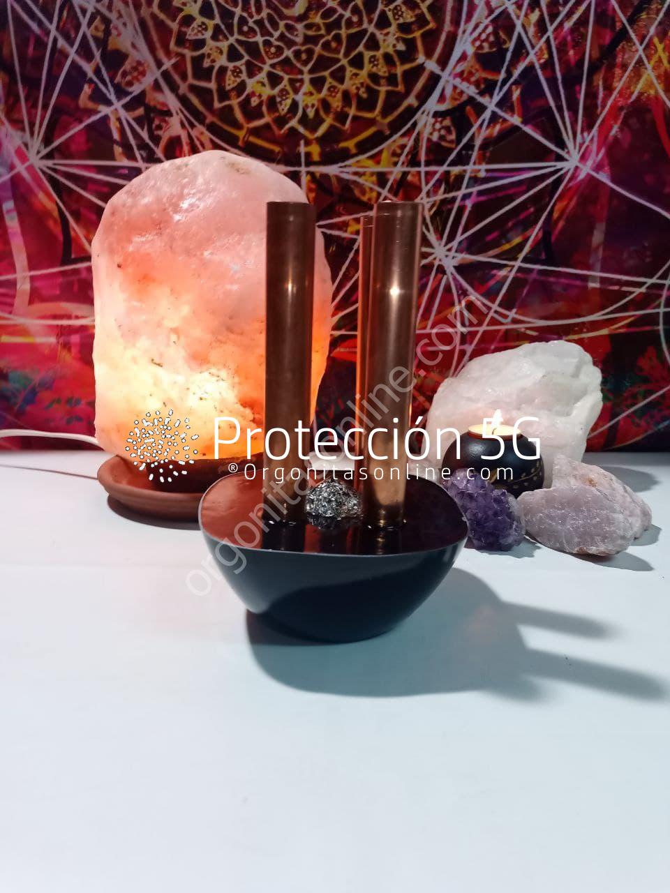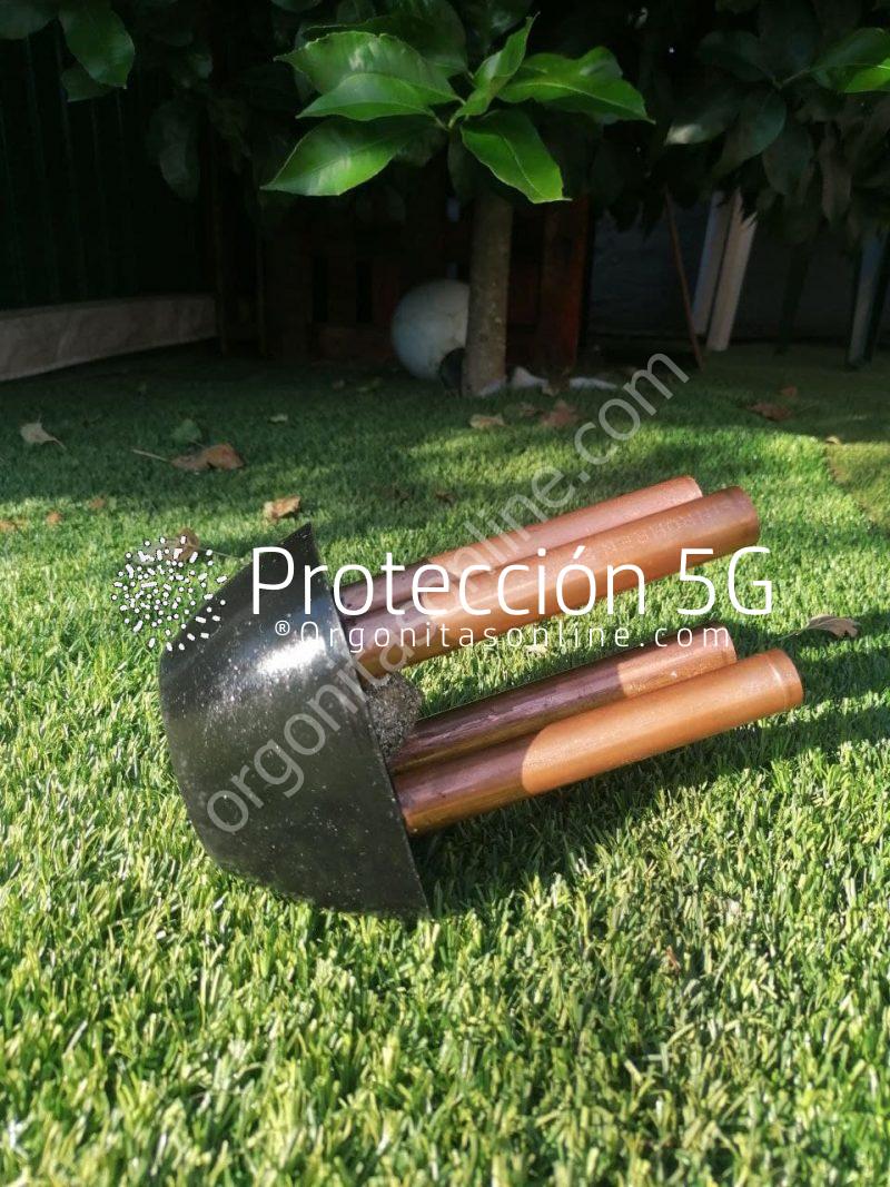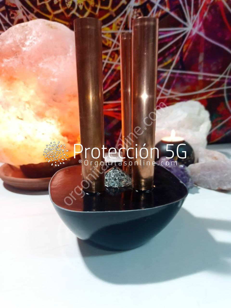 - Con 4 tubos de cobre de 20 cm y 22 mm. de diámetro y en el centro de los tubos, para potenciarlo, lleva una orgonita pirámide diamante.